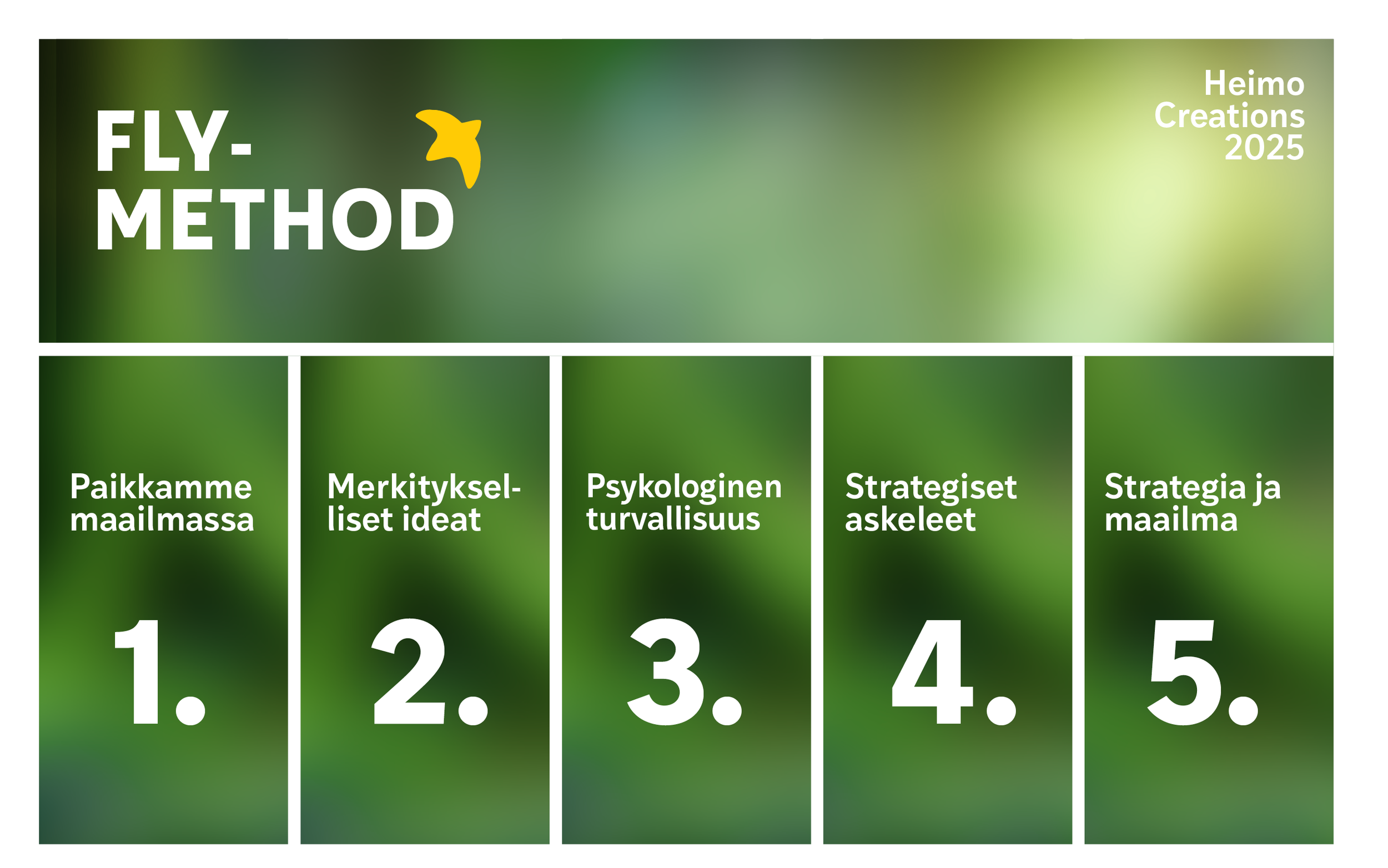 Fly-metodi muuttaa strategiset tavoitteet yhteisiksi, arjen tasolla eteneviksi mikroaskeliksi. Tämä sitouttaa ihmisiä toimimaan ja vie ideat nopeasti käytäntöön.